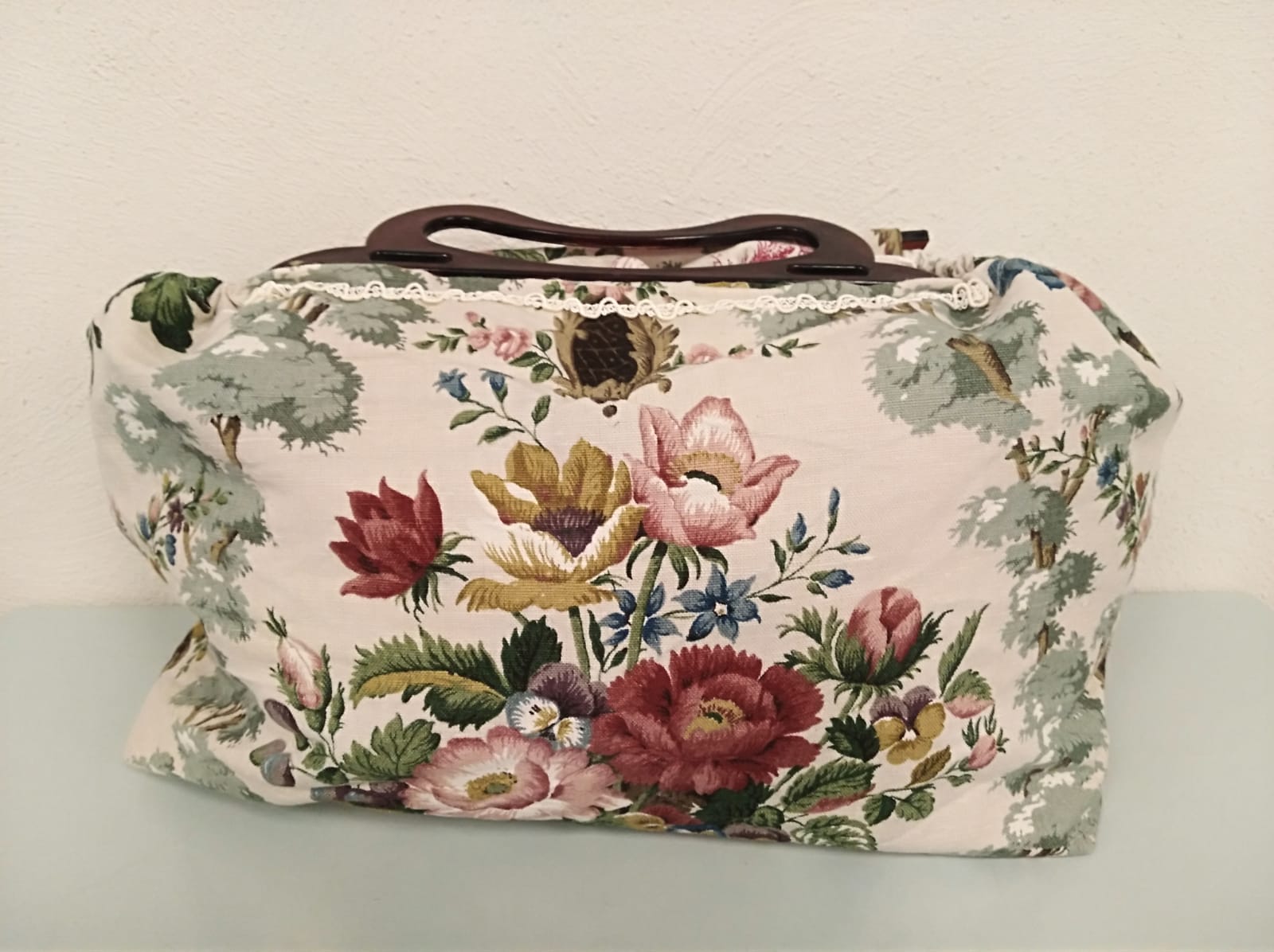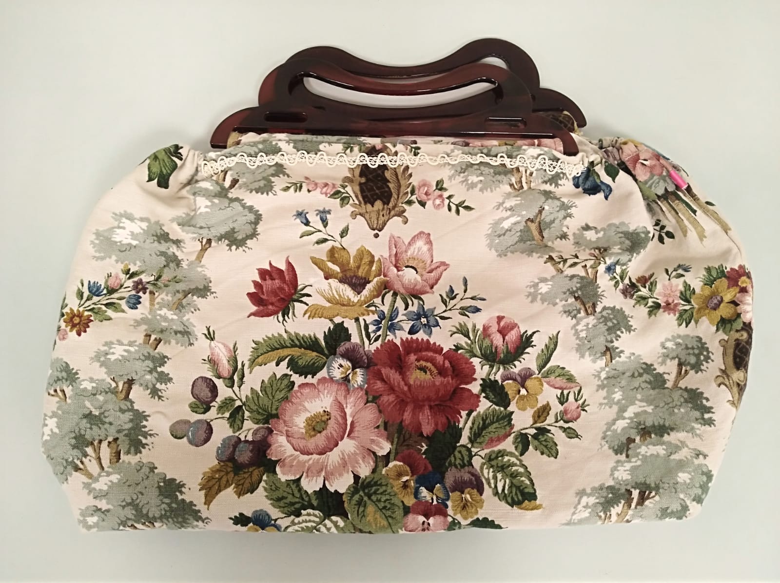 Prachtige, unieke handtas met klein kanten boordje. Maakt elke outfit feestelijk.