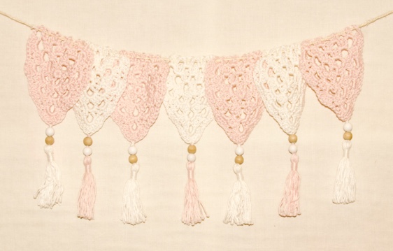 De slinger heeft 7 vlaggetjes in totaal, in de kleuren wit en roze. Helemaal mooi gemaakt met houten kralen aan de onderkant van elk vlaggetje.